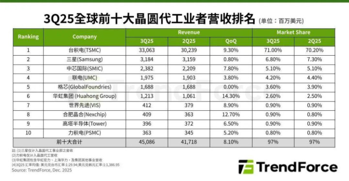根据TrendForce集邦咨询最新调查,2025年第三季全球晶圆代工产业持续受AI高效能运算(HPC),和消费性电子新品主芯片与周边IC需求带动,以7nm(含)以下先进制程生产的高价晶圆贡献营收最为显著,加上部分厂商得益于供应链分化商机,推升前十大晶圆代工厂第三季合计营收季增8.1%,接近451亿美元。