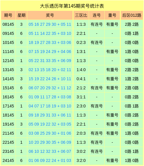 前区重号:在第145期历史同期开奖中,有9期奖号包含了重号,重号出现比例为56.25%,今年同期预计出现1个去年第145期前区重号,参考重号13。